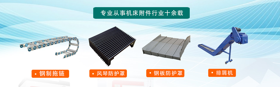 主要產(chǎn)品有:鋼板、不銹鋼板導(dǎo)軌防護(hù)罩、柔性風(fēng)琴式導(dǎo)軌防護(hù)罩、不銹鋼片盔甲防護(hù)罩、伸縮式絲杠防護(hù)罩、油缸氣缸保護(hù)套、螺旋鋼帶保護(hù)套、卷簾伸縮防護(hù)罩、鋁型材防護(hù)簾、排屑機(jī)、機(jī)床工作燈、機(jī)床墊鐵、可調(diào)塑料冷卻管、金屬冷卻管、機(jī)床導(dǎo)軌刮屑板、T型撞塊槽板、塑料法蘭蓋、鋼管護(hù)帽等產(chǎn)品。
